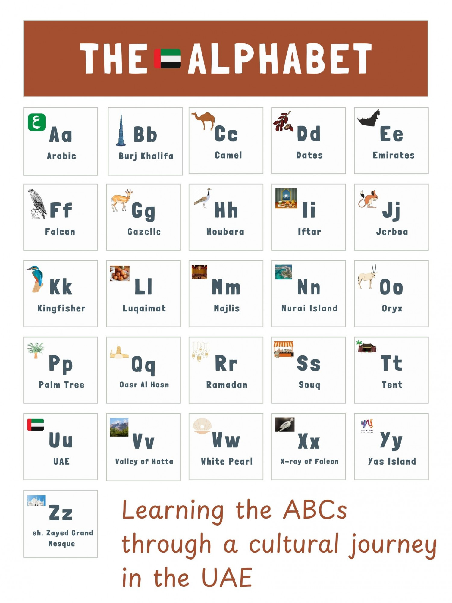 Make learning the alphabet a fun and enriching experience with The UAE Alphabet poster! This beautifully designed educational poster introduces children and learners of all ages to the ABCs while showcasing words inspired by UAE culture, heritage, and traditions.
